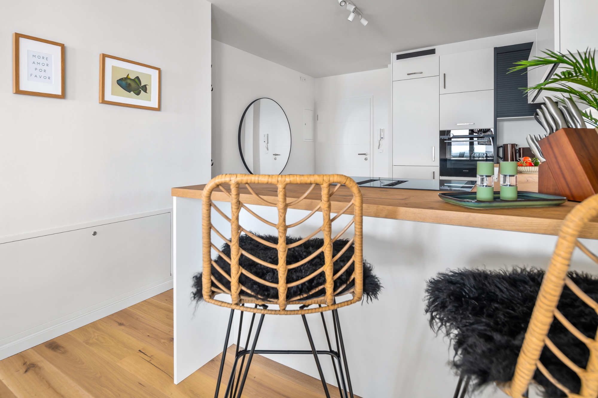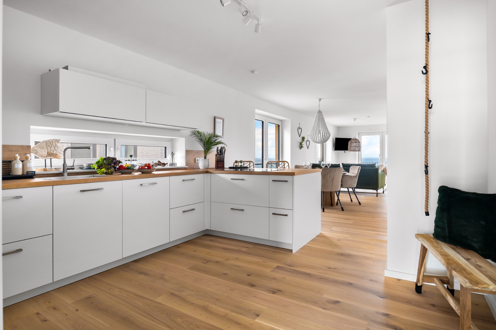 Freuen Sie sich auf Komfort und Gemütlichkeit direkt am Meer. Der offene Wohnbereich mit komplett ausgestatteter Küche, großem Esstisch und gemütlichem Sofa lädt zu geselliger Runde ein.